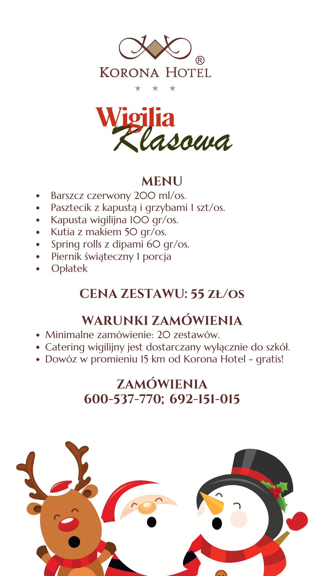 Zapraszamy do sprawdzenia tegorocznej oferty świątecznego cateringu Korona Hotel. Przygotowujemy tradycyjne potrawy, domowe ciasta oraz nasze rozpoznawalne w regionie pieczone i wędzone mięsa. Oferujemy catering z dowozem i odbiorem własnym na terenie Ostrołęki i okolic oraz specjalne menu wigilijne dla szkół i przedszkoli.